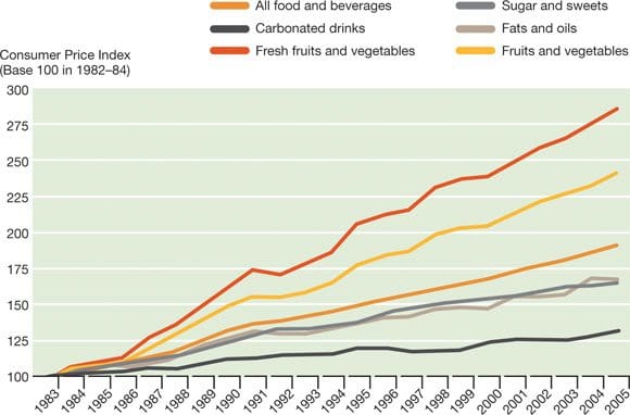 Figure 3. Consumer Price Index for various food categories (1983–2005). Fresh fruits and vegetables have risen in price far faster than processed foods and sweetened beverages.