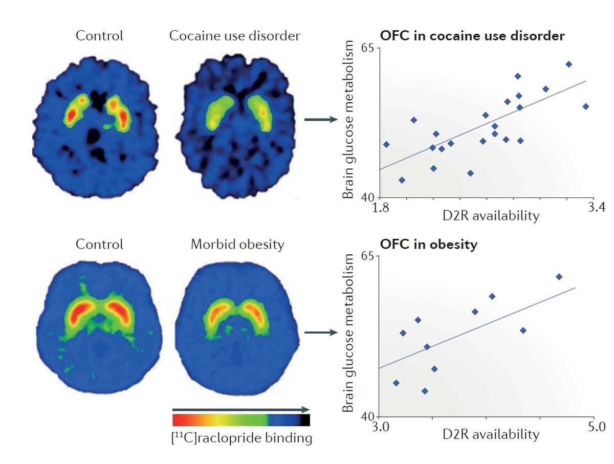Figure 9. PET scan comparisons showing reduced dopamine D2 receptor (D2R) availability in both cocaine use disorder (top) and obesity (bottom), with similar positive correlations to orbitofrontal cortex (OFC) metabolism.