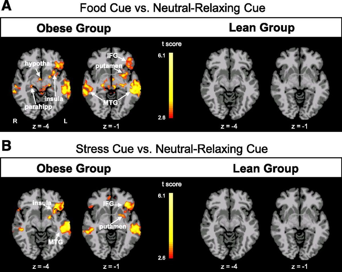 Figure 8. fMRI scans comparing brain activation in obese vs. lean individuals in response to food cues (top) and stress cues (bottom). The obese group shows markedly greater activation in the hypothalamus, insula, putamen, and other regions involved in craving and reward.
